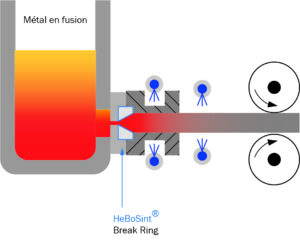 - Anneaux de rupture et anneaux fendus dans la coulée continue horizontale d’acier et de ses alliages: Dans les processus de coulée horizontale, le métal en fusion passe par différentes phases jusqu’à ce qu’il atteigne un anneau réfractaire dans la zone de solidification, où un changement brusque de température se produit. Il est donc essentiel de protéger l’intégrité de l’anneau ou de l’anneau de rupture, car une défaillance à ce stade peut entraîner la perte de la coulée. Le nitrure de bore, associé à différents additifs comme le zirconium, offre une grande résistance aux chocs thermiques tout en assurant des propriétés non adhésives et un faible coefficient de friction.